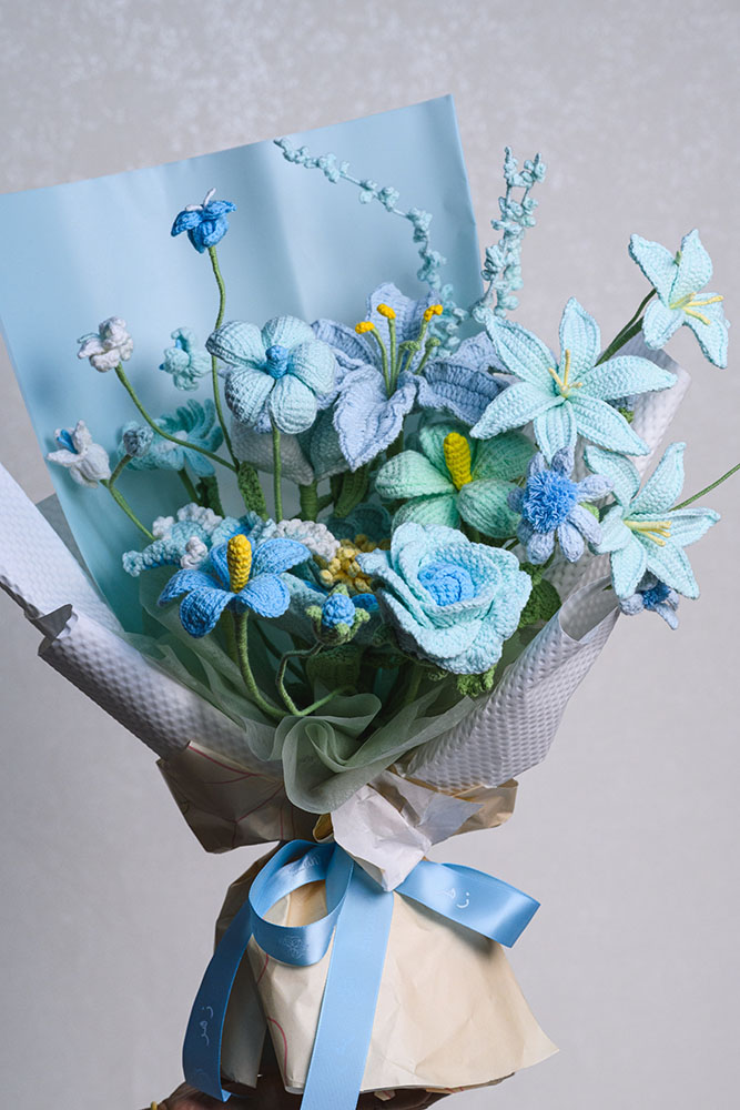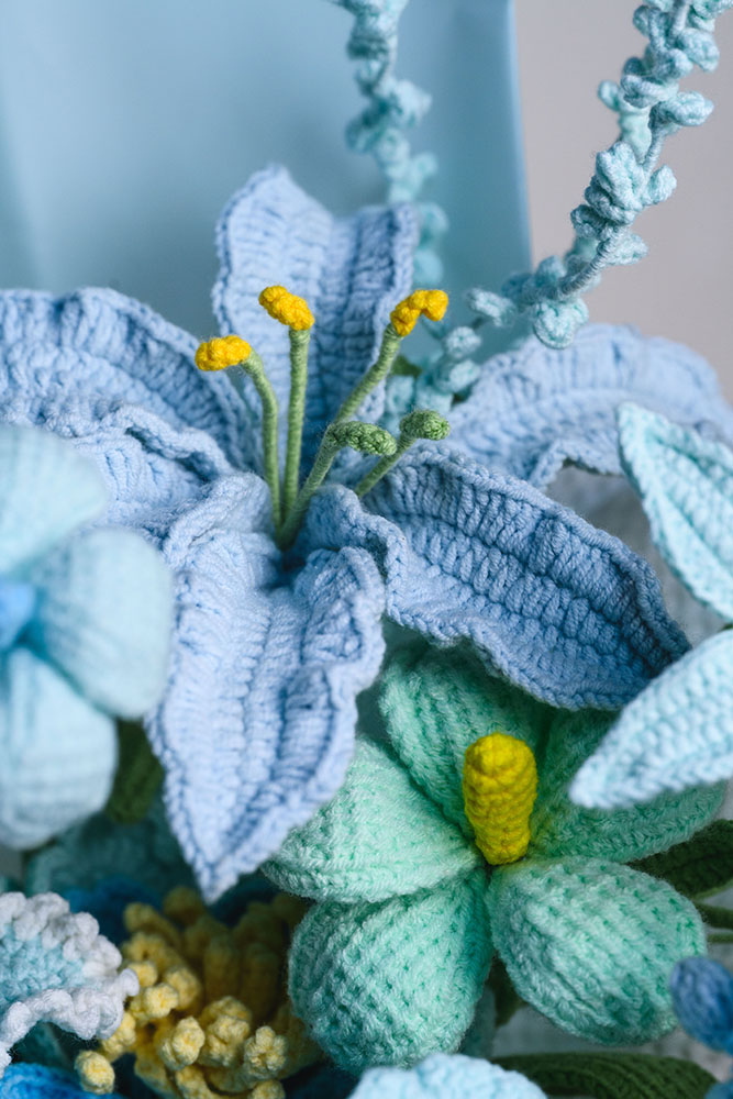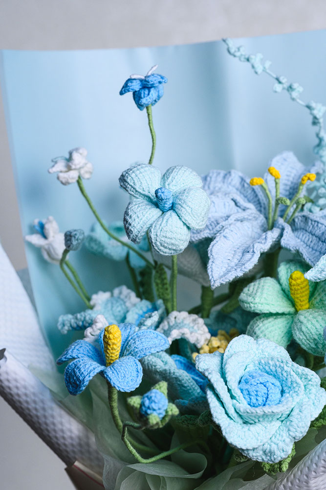 Blue Crochet Flower Bouquet – Handmade Lily, Zephyranthes & Plumeria Arrangement for Gift Giving باقة زهور كروشيه باللون الأزرق – تنسيق يدوي من الزنبق وزهرة الزعفران والبلوميريا للهدايا