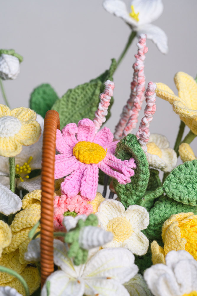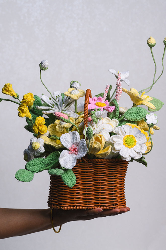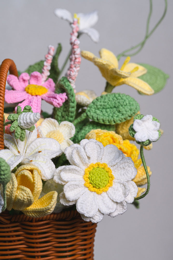• Beautiful Mixed Floral Arrangement – Features a lovely variety of handmade crochet blooms arranged in a woven basket, symbolizing warmth and elegance.