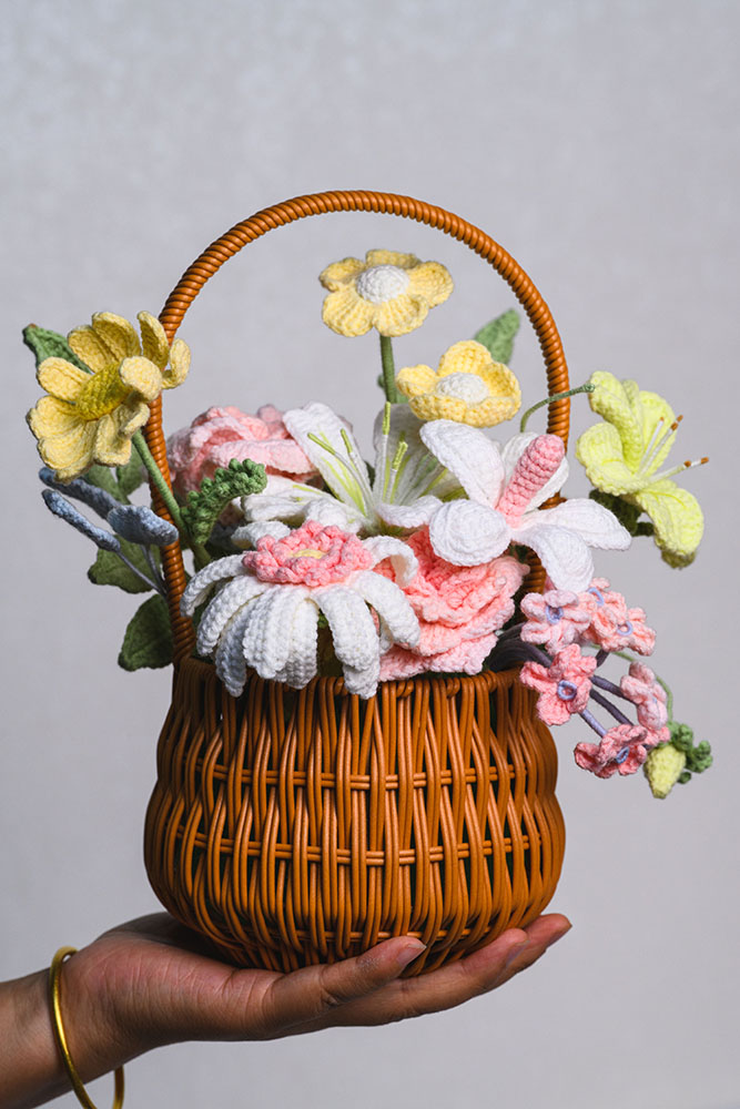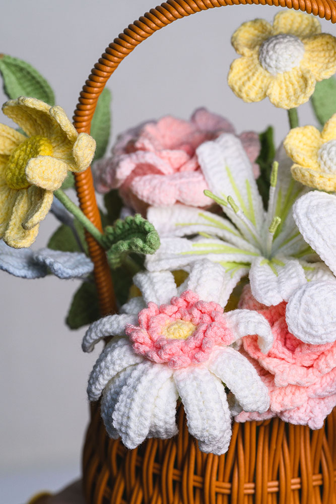 • Beautiful Mixed Floral Arrangement – Features a lovely variety of handmade crochet blooms arranged in a woven basket, symbolizing warmth and elegance.