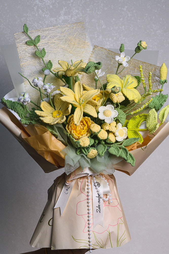 Yellow Crochet Flower Bouquet – Handmade Zephyranthes, Cosmos & Tung Blossom Arrangement for Gift Giving باقة زهور كروشيه باللون الأصفر – تنسيق يدوي من زهرة الزعفران والكونوس وزهرة التونغ