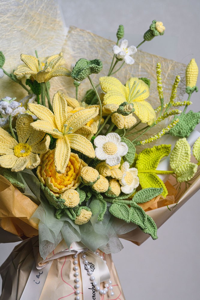 Each flower is crocheted with soft yarn for a natural and elegant look.